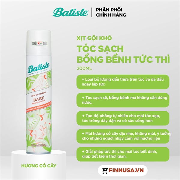 NK - Dầu Gội Khô Batiste Dry Shampoo Bare Barely Scented Hương Cỏ Cây 200ml