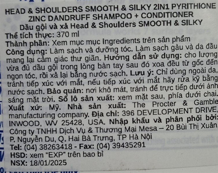 NK - Dầu gội xả Head & Shoulders Smooth & Silky 2-in-1 370ml (12.5 FL OZ)