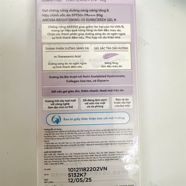 NK - Gel chống nắng dưỡng sáng nâng tông Anessa Brightening UV Sunscreen Gel SPF50+ Pa++++ 90g