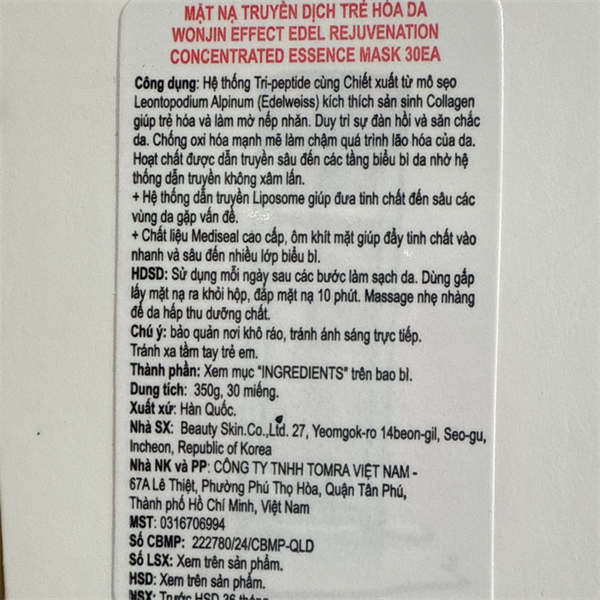 NK - Hộp 30 miếng mặt nạ dịch trẻ hóa da Wonjin Effect Edel Rejuvenation Concentrated Essence Effect Mask 350g