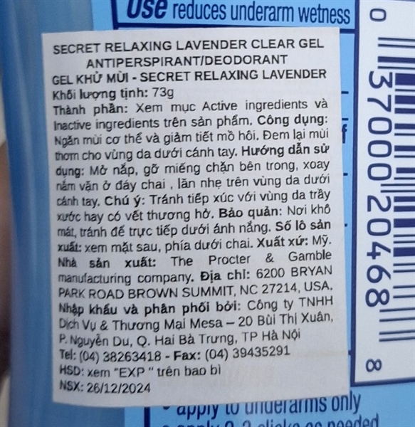 NK - Lăn khử mùi Secret Antiperspirant/Deodorant Clear Gel Relaxing Lavender 72HR Breathable Odor Protection PH Balancing Minerals 2.6Oz 73g