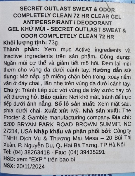 NK - Lăn khử mùi Secret Outlast Sweat & Odor Antiperspirant Deodorant Clear Gel Completely Clean 72HR Protection 2.6 Oz 73g