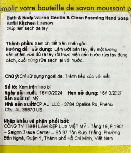 NK - Nước rửa tay dạng bọt BBW Gentle & Clean Foaming Hand Soap Refill Kitchen Lemon 32Oz 946ml