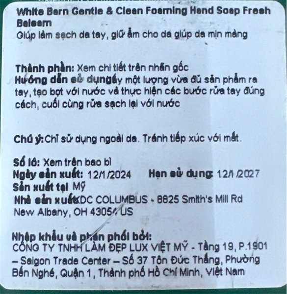 NK - Nước rửa tay dạng bọt BBW Gentle & Clean Foaming Hand Soap White Barn Fresh Balsam 8.75Oz 259ml