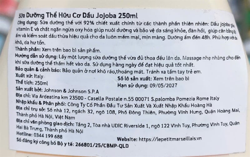 NK-Sữa Dưỡng Ẩm 95% Hữu Cơ Le Petit Marseillais Dầu Jojoba 250ml