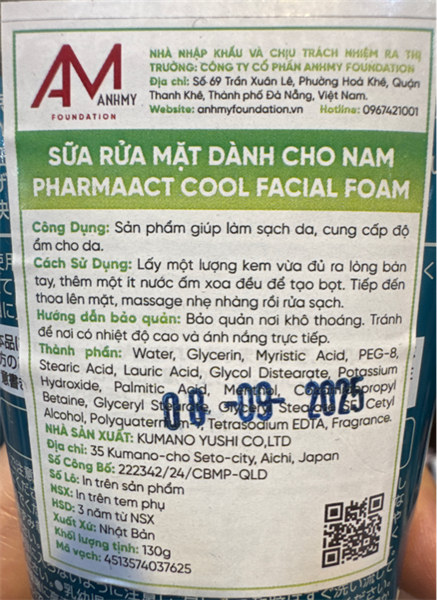 NK - Sữa rửa mặt cho nam Pharmaact Cool Facial Foam 4.59Oz 130g