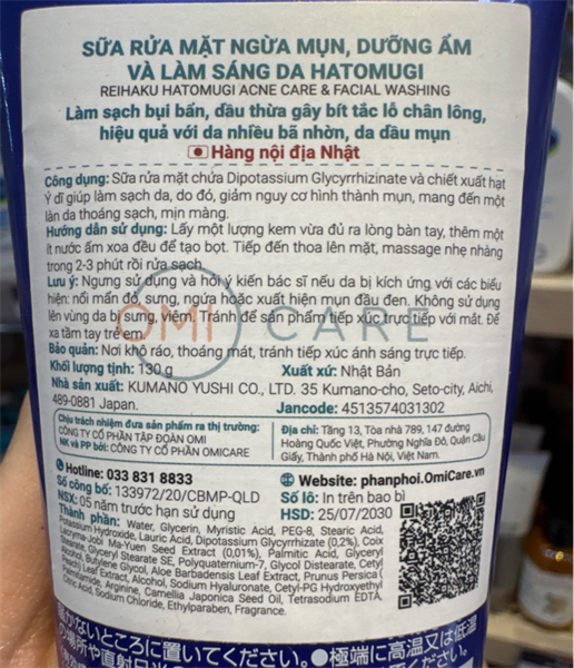 NK - Sữa rửa mặt ngừa mụn dưỡng ẩm Hatomugi Acne Care & Facial Washing 4.59Oz 130g