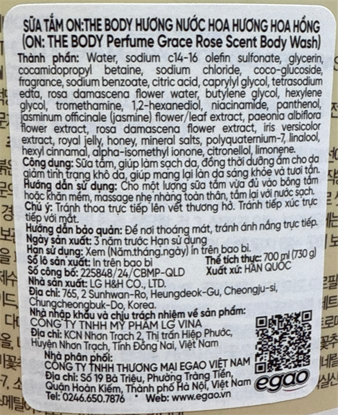NK - Sữa tắm dưỡng ẩm hương nước hoa hương hoa hồng On The Body Grace Rose 730g