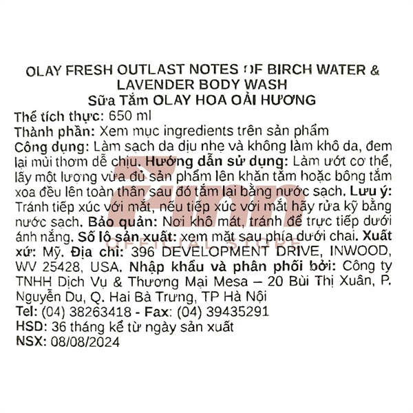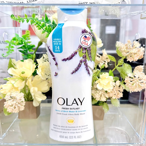 NK - Sữa tắm Olay Fresh Outlast – Birch Water & Lavender 24HR Fresh Vibes Body Wash 650mL 22Oz
