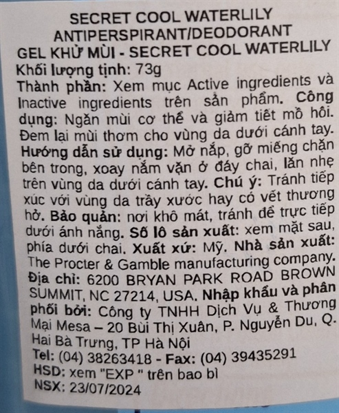 (SALE-T6/26) NK - Lăn khử mùi Secret Antiperspirant/Deodorant Clear Gel Cool Waterlily 48HR Protection PH Balancing Minerals 2.6 Oz 73g